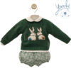 La blusa blanca, de corte tradicional, añade luminosidad y equilibrio al conjunto. El jersey azul pone el toque más encantador gracias a los dos conejos tejidos en el centro, que aportan un aire tierno y lleno de personalidad.