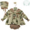 Sumérgete en un cuento de verano con este vestido verde con casas en los árboles. El estampado delicado evoca paseos entre ramas y luz dorada; la braga y el cuello en cuadros marrón le aportan contraste y carácter.