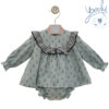 Este conjunto infantil destaca por su diseño único y lleno de personalidad. El vestido, con un fondo verde y estampado de pequeños pinos negros, ofrece un estilo natural y divertido.