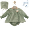Este conjunto infantil combina originalidad y dulzura en cada detalle. El vestido y la braga presentan un suave fondo verde decorado con pequeñas letras, creando un estampado divertido y delicado.