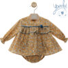 Este precioso conjunto destaca por su delicado estampado de flores en tonos ocre y su encantador detalle de pompón azul bajo el cuello, que aporta un toque de originalidad y dulzura.