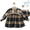 El vestido de cuadros en tonos marino y ocre está confeccionado en un tejido suave y cálido, perfecto para la temporada de otoño e invierno. La braga a juego completa el look, ofreciendo una apariencia coordinada y cuidada para tu pequeña.