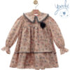 Un vestido de delicado color rosa adornado con un estampado floral en tonos azules y verdes, con un cuello con los bordes en azul. Confeccionado en un tejido suave y fresco, resulta perfecto para los días más cálidos o para ocasiones especiales.
